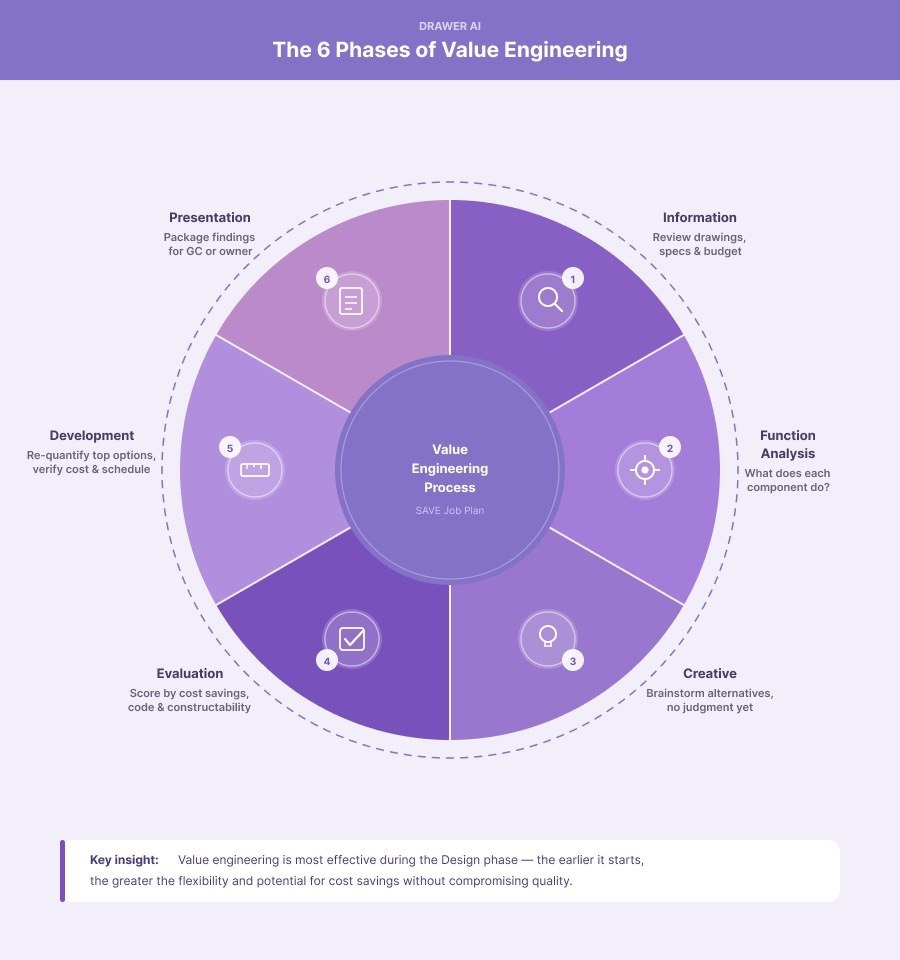 For electrical subcontractors, VE requests frequently originate from general contractors after bids have been submitted. GCs may ask subs to revisit their proposals and identify areas for cost reduction or efficiency improvement, often in response to owner feedback or budget reviews.